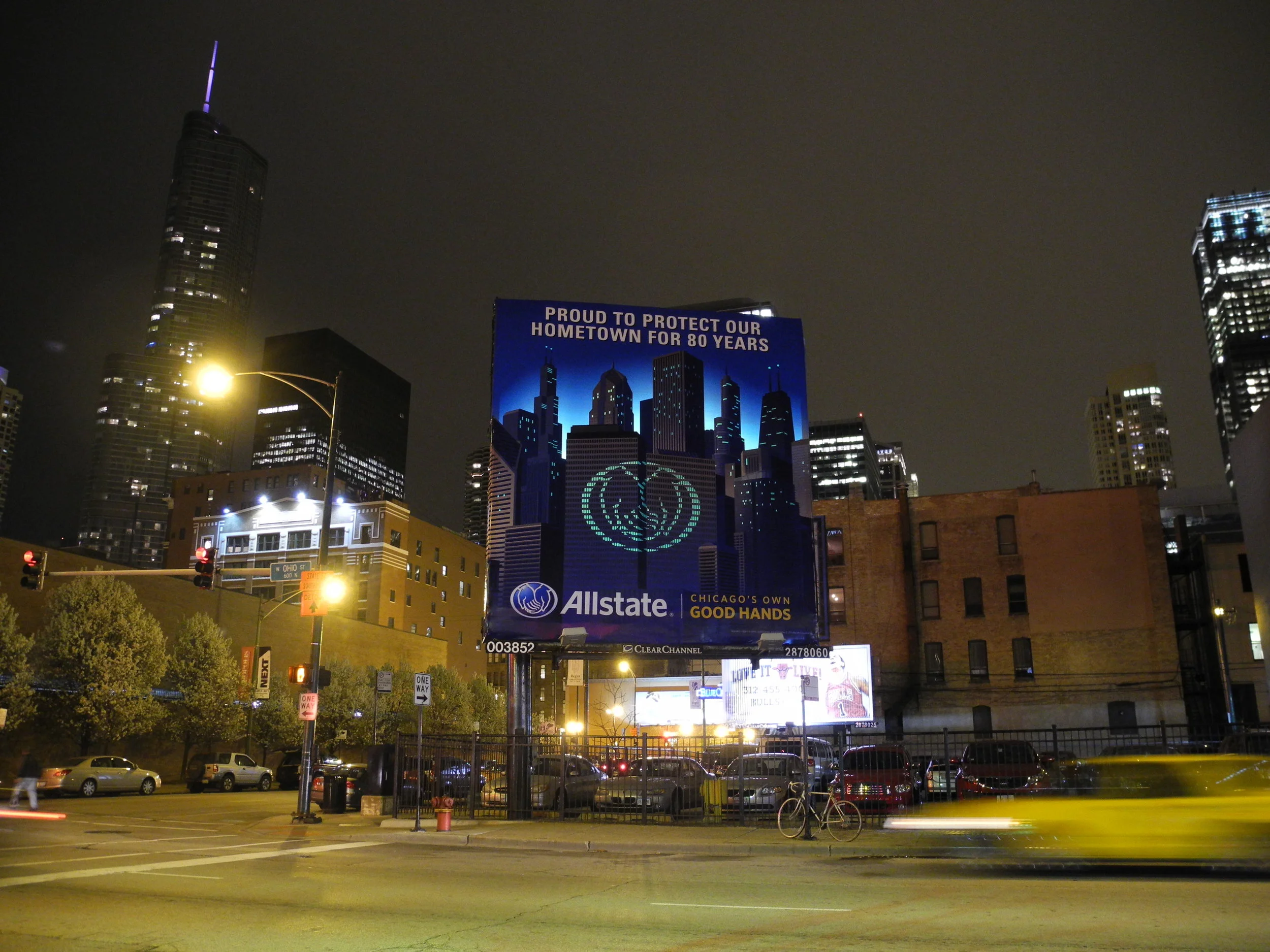 A Chicago billboard created for Allstate for their 80th anniversary: equipped with 52 electroluminescent panels to reveal the good hands message.